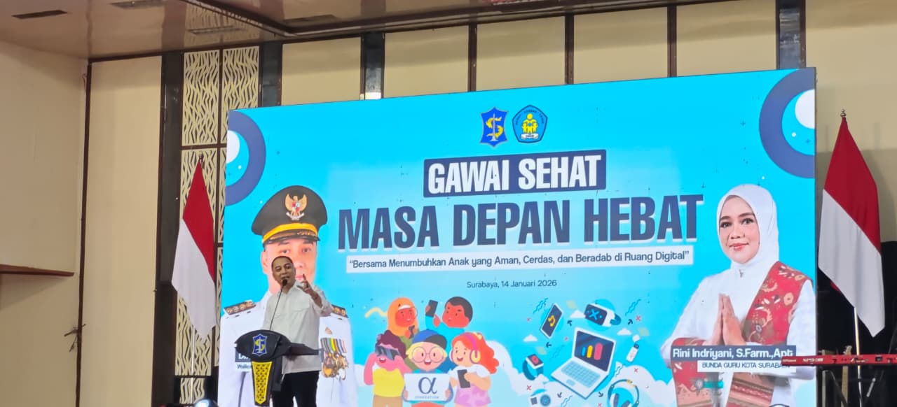 Mengusung tema “Gawai Sehat Masa Depan Hebat, Bersama Menumbuhkan Anak yang Aman, Cerdas, dan Beradab di Ruang Digital”, Pemkot Surabaya menegaskan bahwa gawai bukan lagi sekadar alat bantu belajar, tetapi juga berpotensi menjadi pintu masuk radikalisme, pornografi, narkotika, hingga kekerasan jika tidak dikendalikan secara tegas.